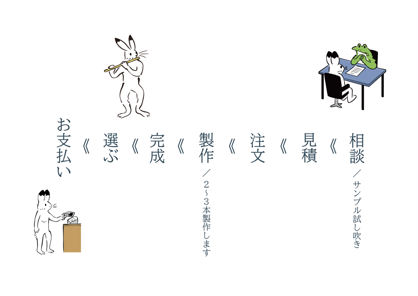 ご相談をいただき、要望を伺って仕様など決めてまいります。注文からお渡しまでは約6ヶ月。支払いはお渡し時です。配送&オンライン決済も可能です。